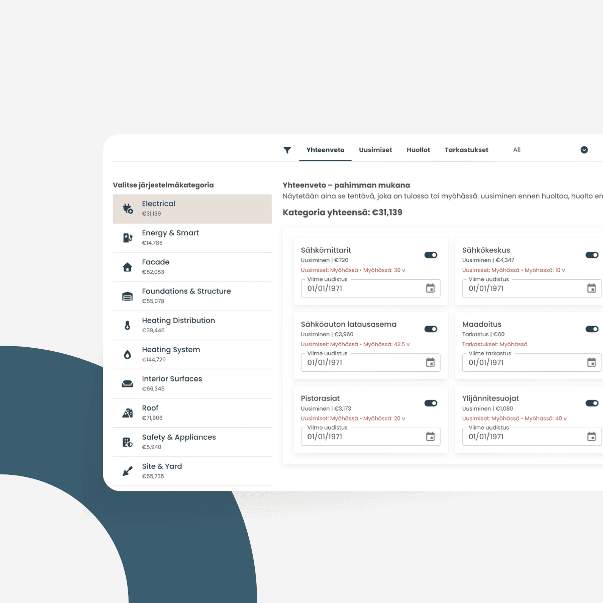 Luju hallintapaneeli antaa sinulle reaaliaikaisen kokonaiskuvan kotisi tilanteesta. Näet tärkeimmät tiedot, tulevat toimenpiteet ja kustannukset yhdellä silmäyksellä — ilman turhaa etsimistä.